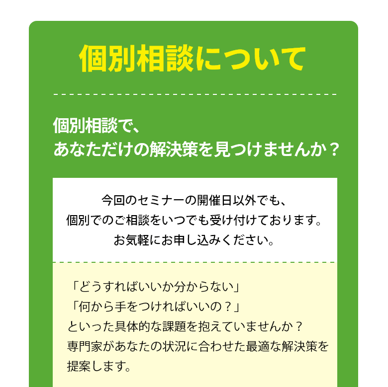 イベント当日以外にも 個別相談会を開催しております。ご希望の日程に合わせて、経験豊富な専門家がじっくりとご相談を承りますので、ぜひお気軽にお問い合わせください。